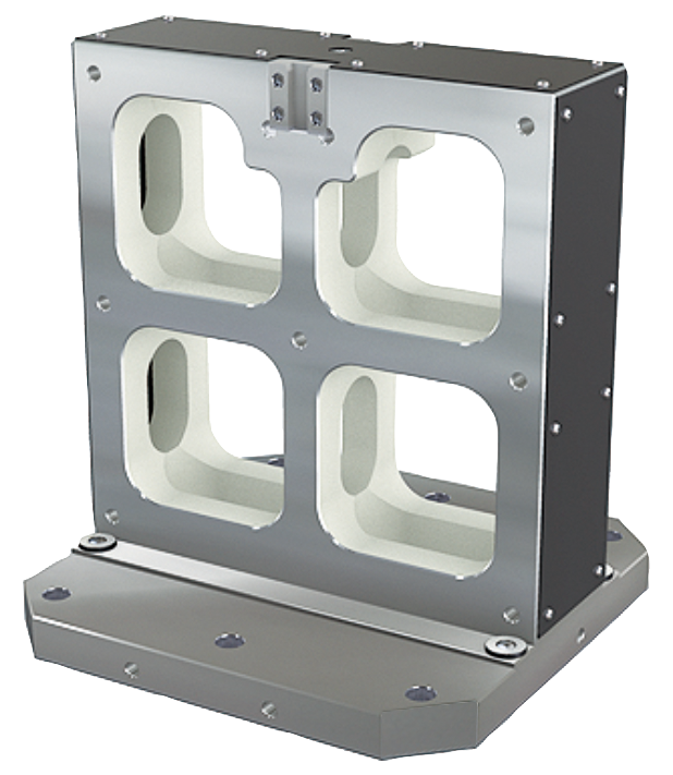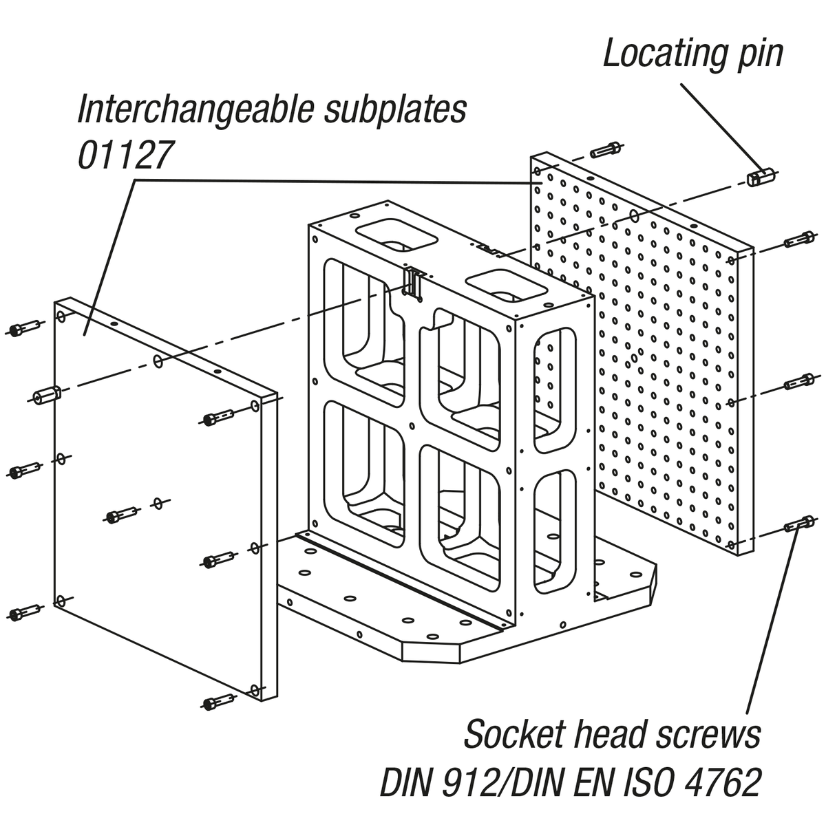 Interchangeable subplates can be positioned and mounted on both sides of the tombstone. This means that clamping fixtures can be replaced efficiently. The tombstones conform to machine tables for machine tools acc. to DIN 55201 and JIS6337-1980. Please order locating pins for positioning tombstones on machine tables acc. to DIN 55201 separately.