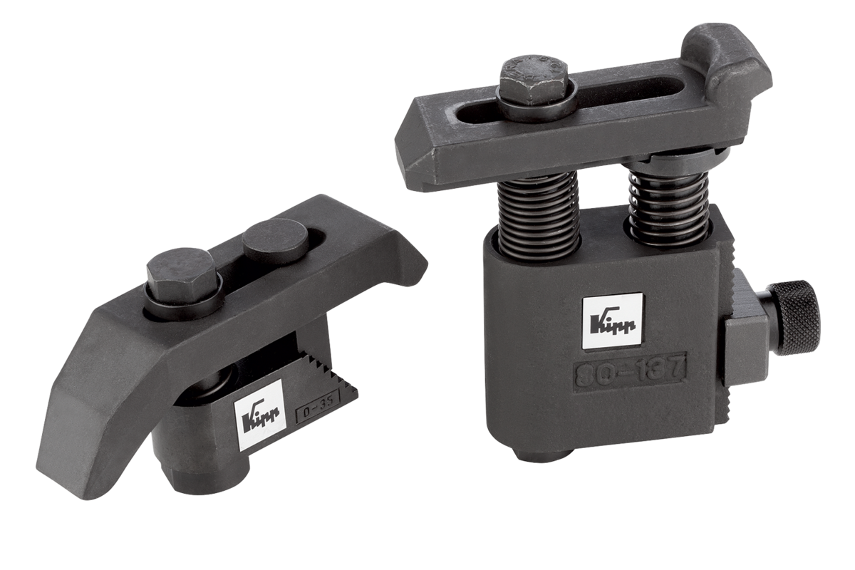 These clamp strap modules are universal, flexible clamps constructed from individual components building a compact unit. There are no loose parts which first have to be altered for a clamping operation. The compact design allows these clamps to be placed close to the workpiece enabling the full area of the machine table to be used.