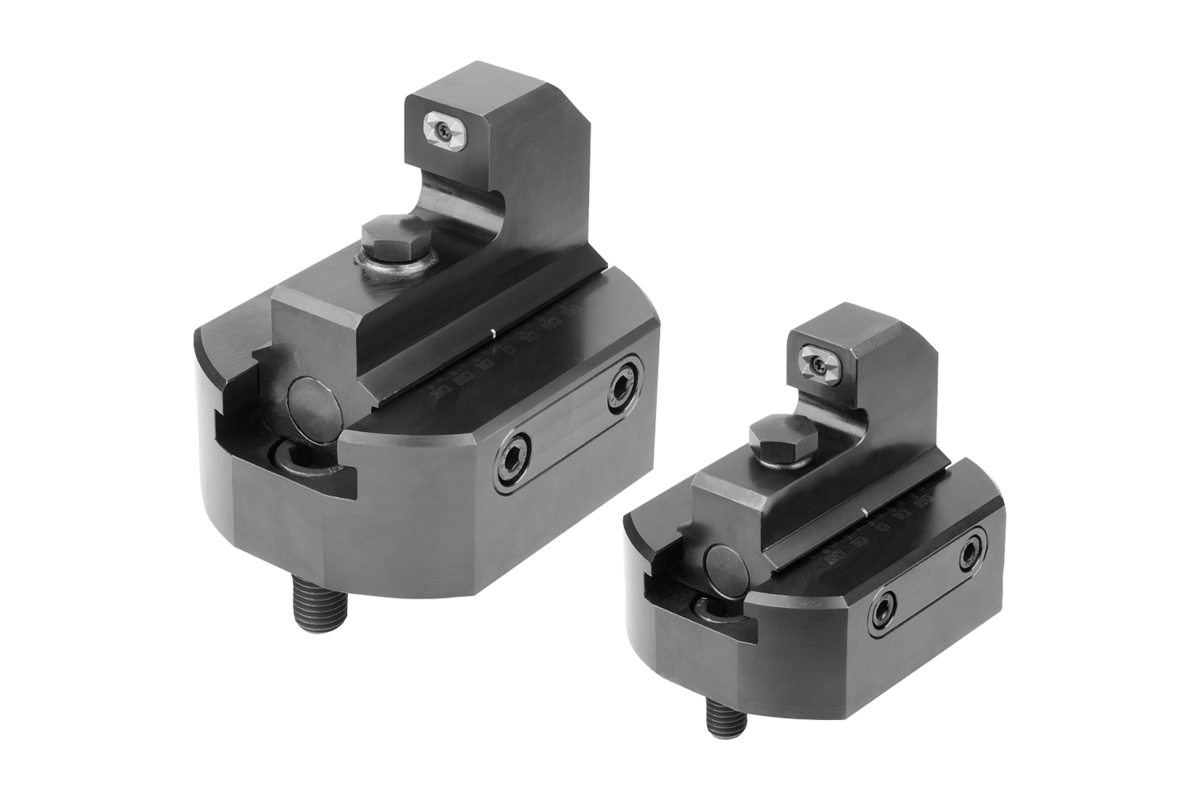 The fixed stop with grip insert is used as a counterpart for the clamping element with grip insert 04486. The extremely sturdy structure and compact design make the fixed stop suitable for pre-machining for direct clamping (OP10) with the 5-axis modular clamping system and for the rough part clamping of any plates and other workpieces.