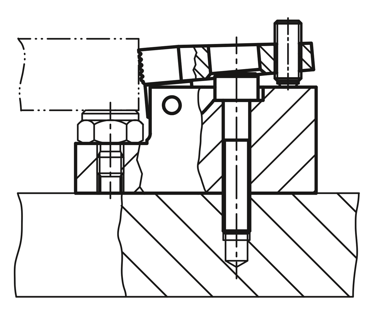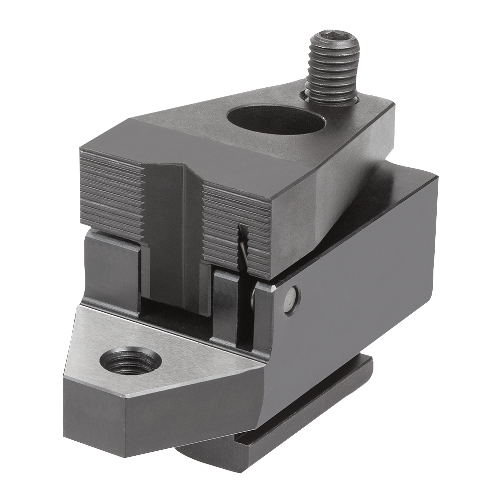 Tightening the ball-end thrust screw moves the jaw plates forwards. The workpiece is pushed against the fixed stop and simultaneously forced down onto the seating face. This side clamp has a ground seating face and tapped hole for adjustable support elements.