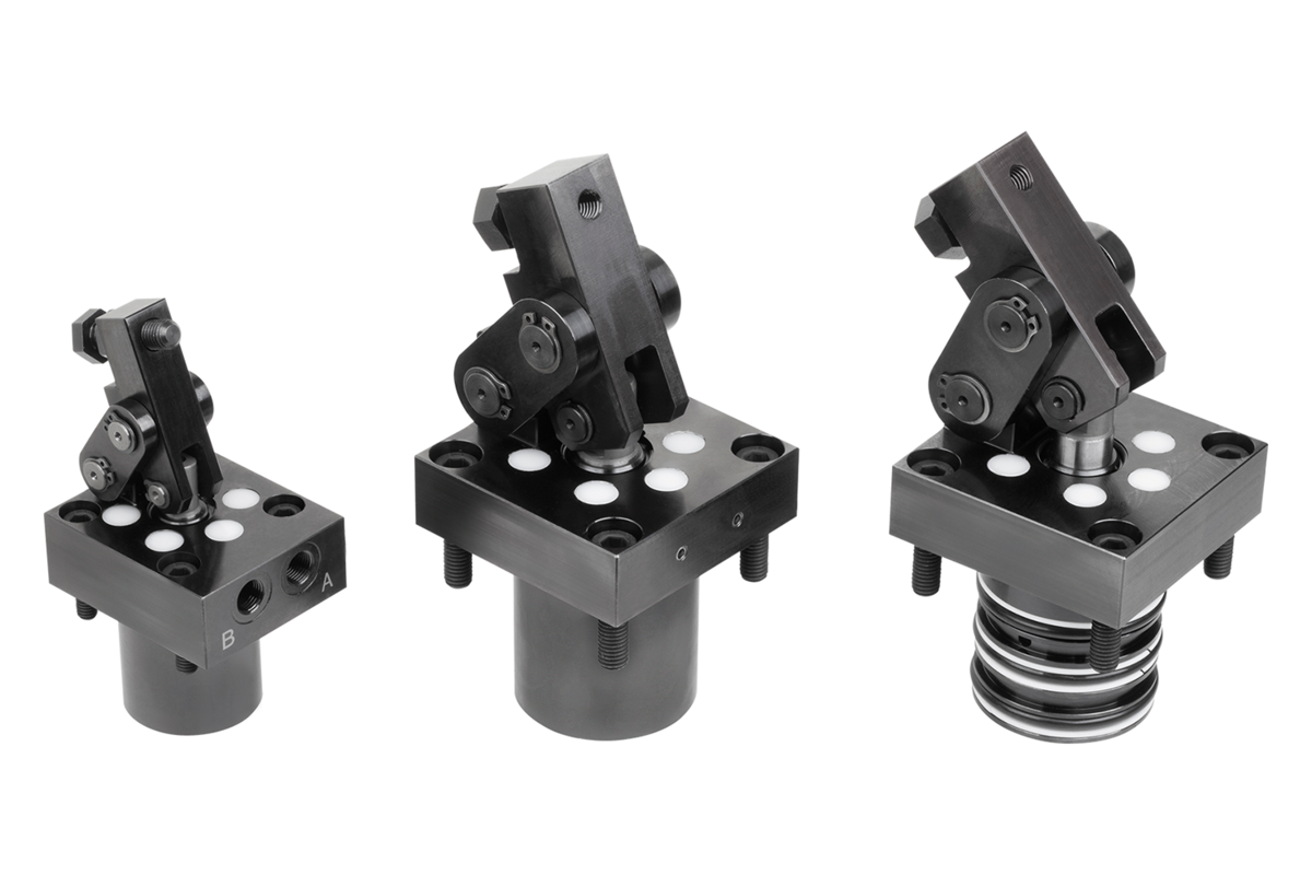 Link clamps are the optimal choice when, due to the clamping situation, the workpiece needs to be freely removed from above when unclamped. Due to the linear movement of the clamping lever when opening or closing the link clamp, it is particularly suitable for clamping situations where a lateral movement of the clamping element is not possible, e.g. due to interfering contours. The force is transferred to the tensioning lever of the link clamp via the piston. The opening and closing times are clearly defined due to the link clamps double-acting mode of operation.