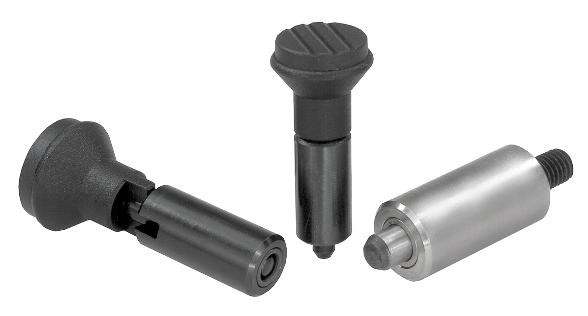 Indexing plungers, steel or stainless steel, smooth version without collar, with plastic mushroom grip and cap, with locking slot