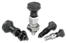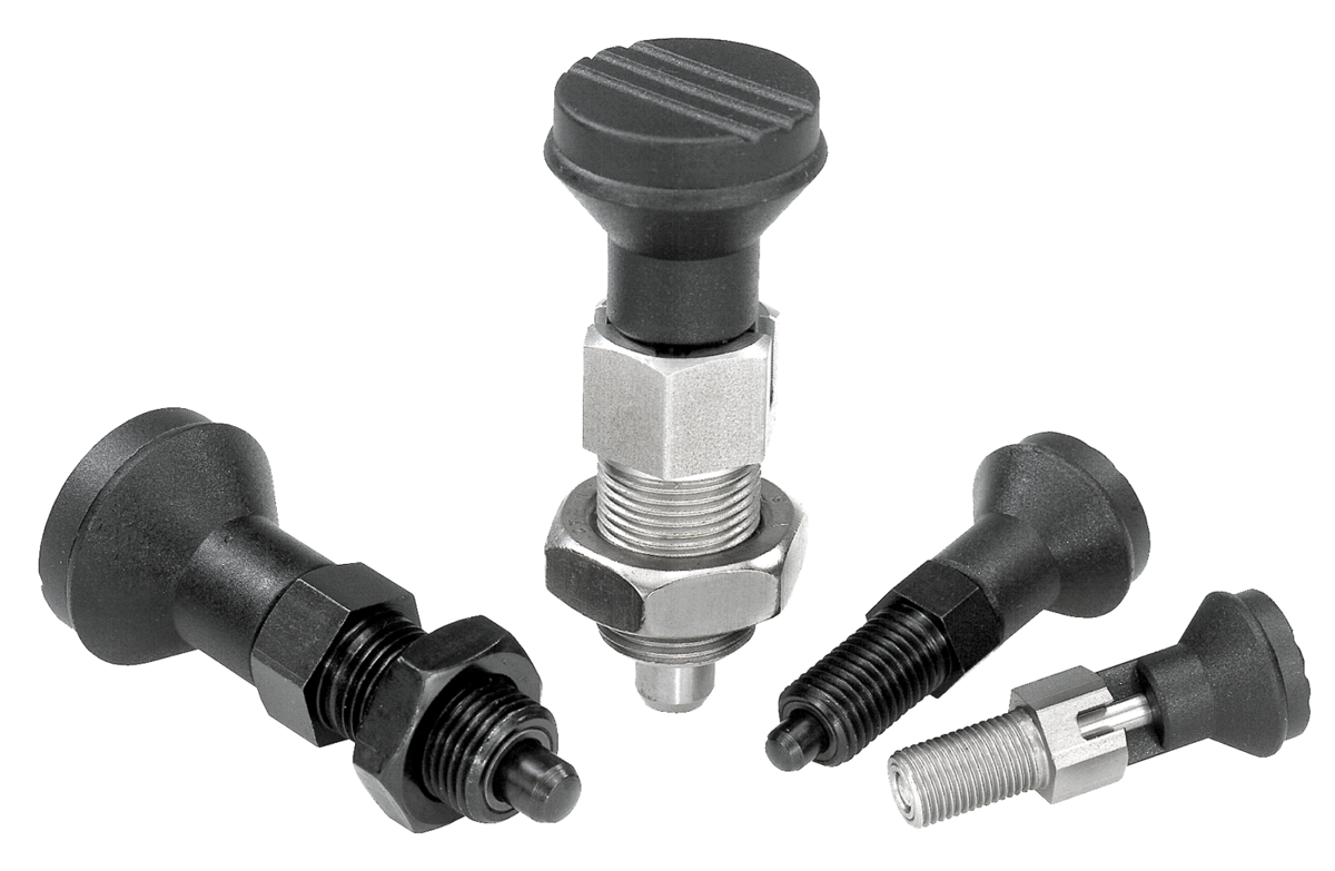 Indexing plungers, steel or stainless steel with plastic mushroom grip and cap, with locking slot and locknut