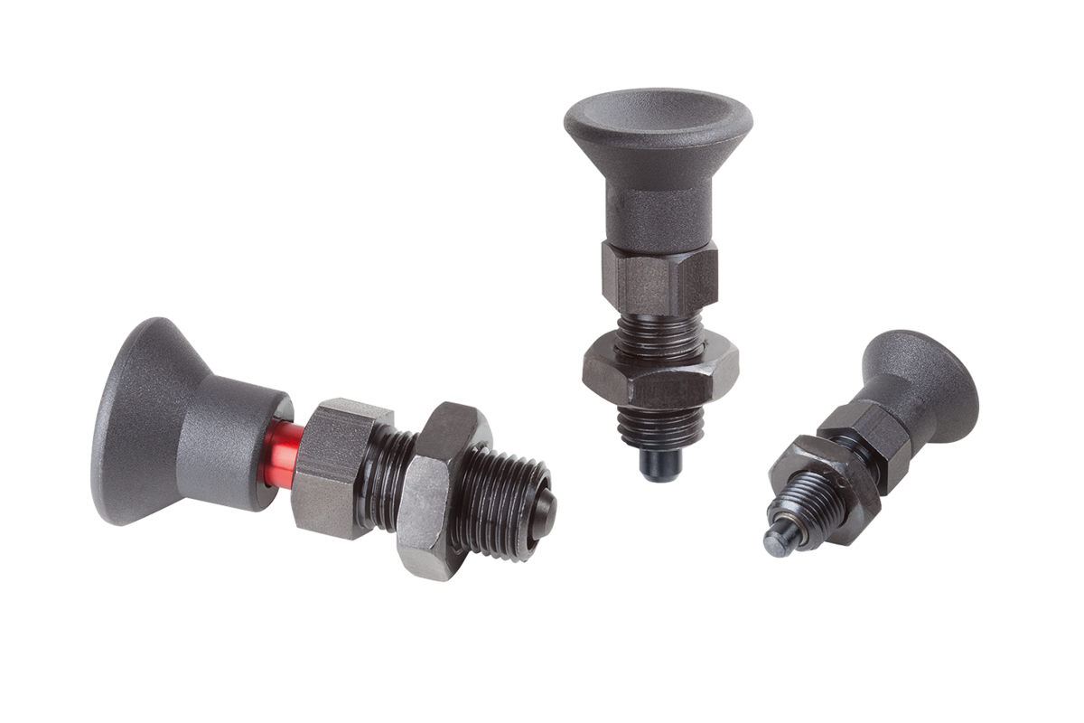 Indexing plungers, steel with plastic mushroom grip, locked mark and locknut