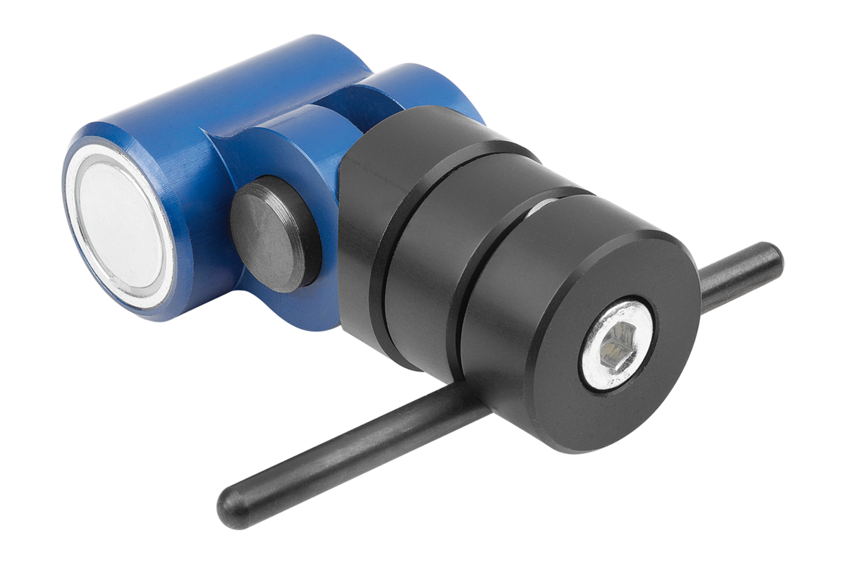 The workpiece stop with enclosed magnet serves, among other things, as a versatile instrument for positioning on machining centres or for assembly work. It adheres to all magnetic surfaces such as vices, measuring devices, drilling and milling machines. After clamping the workpieces, the workpiece stop can also be easily removed again, thus exposing all surfaces to be machined.