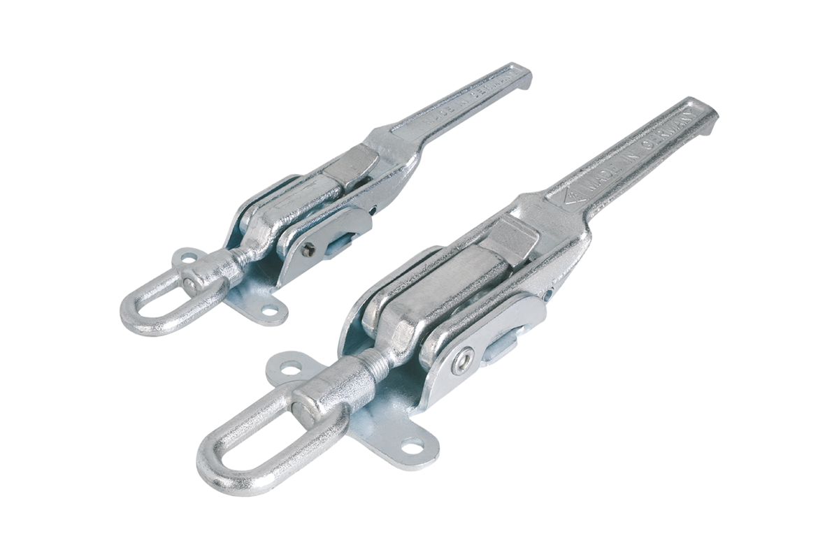 Heavy-duty forged latches for high tensile loads. Primarily used on utility vehicles, agricultural and construction machinery. A ratchet prevents unintentional opening when closed.