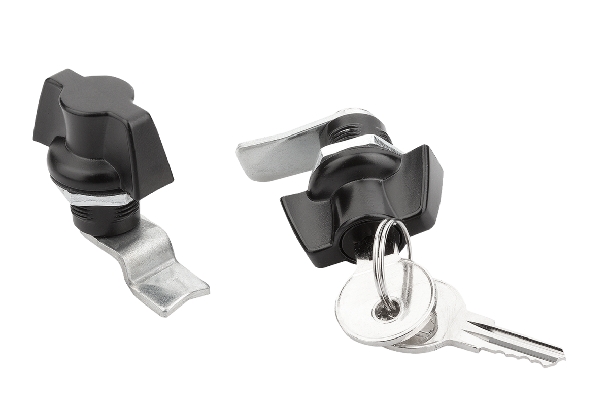 The lockable quarter-turn locks are supplied with 2 keys. The key can be removed in both positions (opened and closed). The cylinder locks have a single key system i.e. the same key works in all locks (cylinder lock 2233).