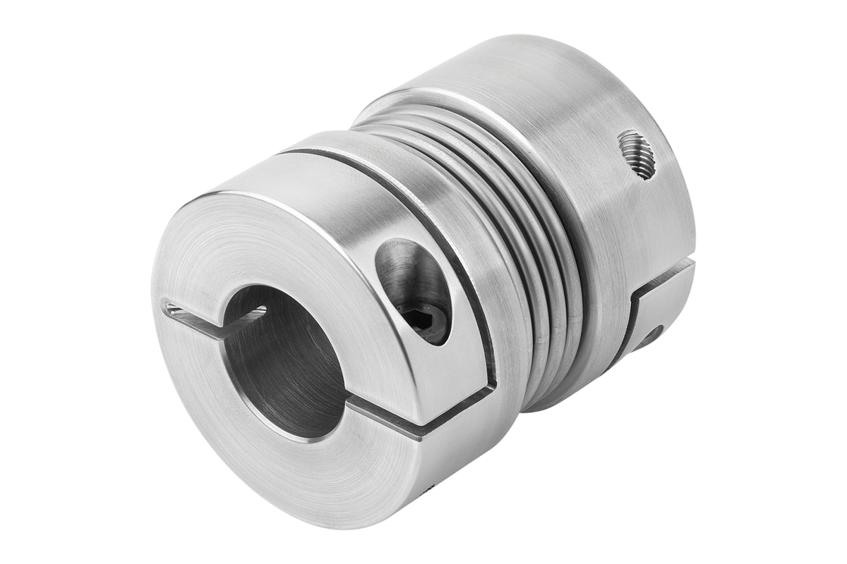 Metal bellows coupling with high torsional rigidity. The metal bellows compensates for axial, radial and angular shaft misalignment with low restoring forces. With clamping hubs for fastening to shafts.