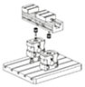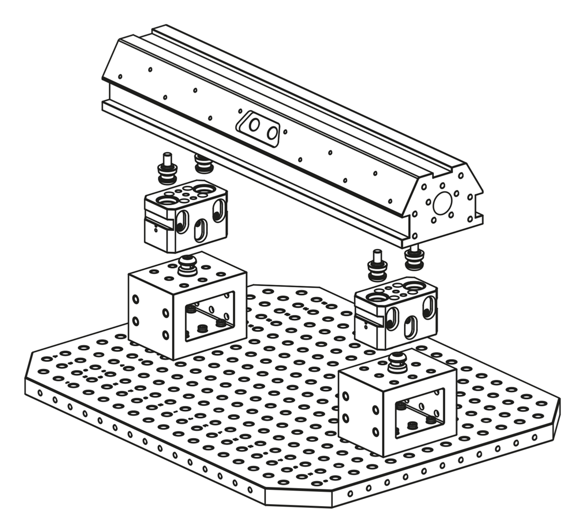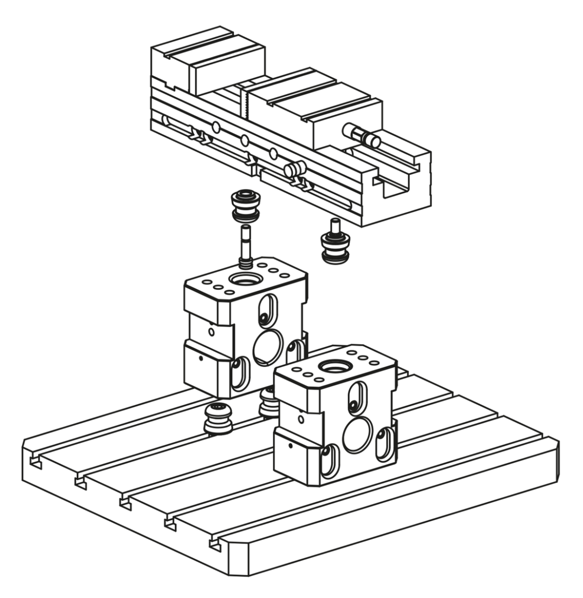 Do stabilnych podwyższeń imadła dwa 5-osiowe moduły bazowe DUO UNILOCK są mocowane na stole maszynowym podwójnym złączem w dół. Mocowanie imadeł jest wykonywane ze złączem pojedynczym do góry.